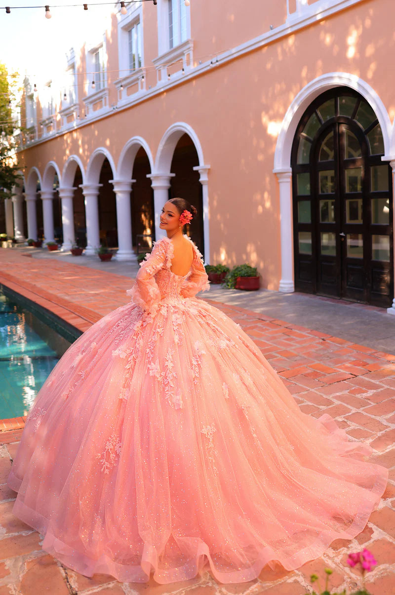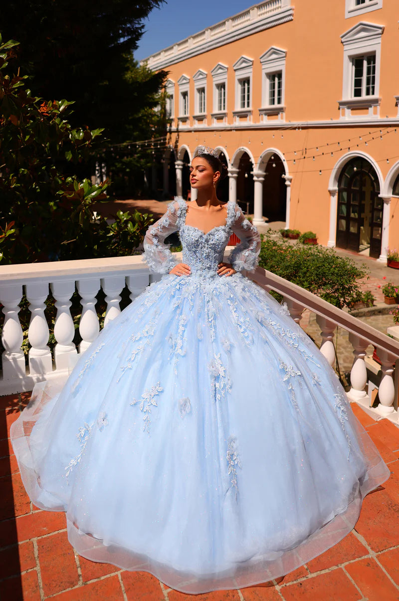 Experience a floral fantasy with this exquisite quinceañera ball gown. Embroidered lace and intricate three-dimensional flower accents adorn every inch of this dazzling dress. The bell sleeve design adds an air of elegance and sophistication to this stunning ensemble. The lace exudes a radiant shimmer, elevating the overall appearance and capturing attention from every angle. As for the semi-sweetheart neckline, we couldn’t choose a better design to boost your confidence in this incredible creation. Prepare to make a grand entrance and leave a lasting impression with this tantalizing quinceañera gown. A true jaw-dropper!