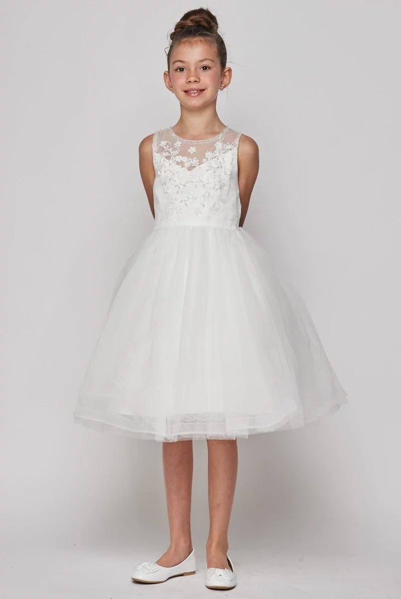 Super elegant sleeveless illusion dress, adorned with 3D flowers, open back and tulle skirt.