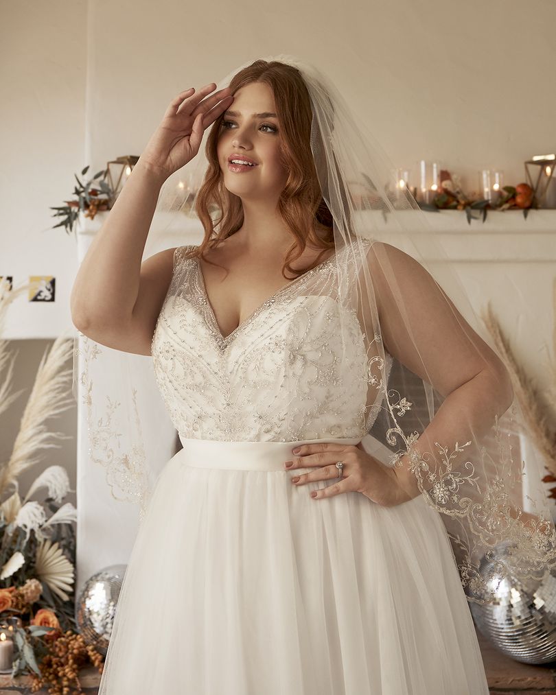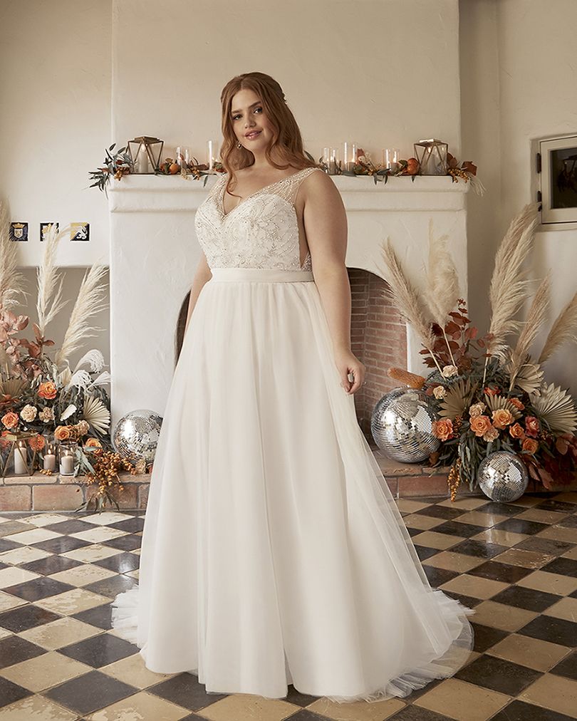 Sweet Style BL349 Daria is effortlessly romantic, made up of the softest tulle and satin. A V-neckline defines this simple sheath wedding dress from Beloved by Casablanca Bridal, decorated with delicate beading and embroidery which travels up the tank straps and down the matching sheer V-back. A sewn-in ribbon accentuates the natural waist, making way for a lightweight and lavish soft tulle skirt with a 67”