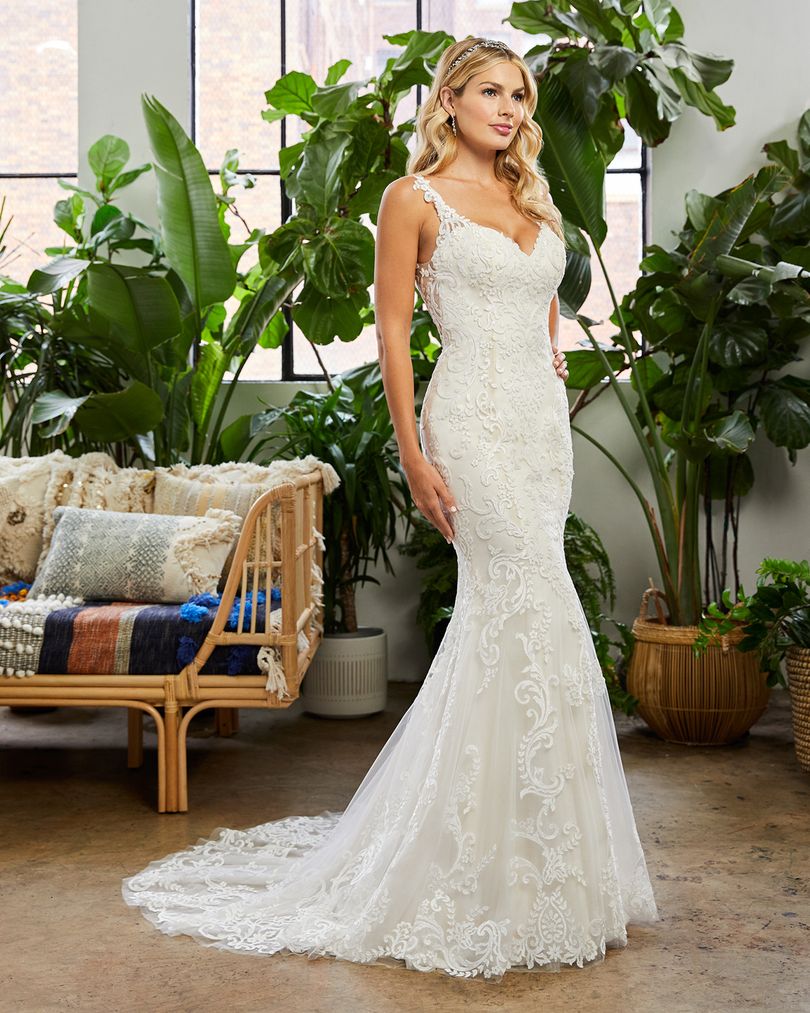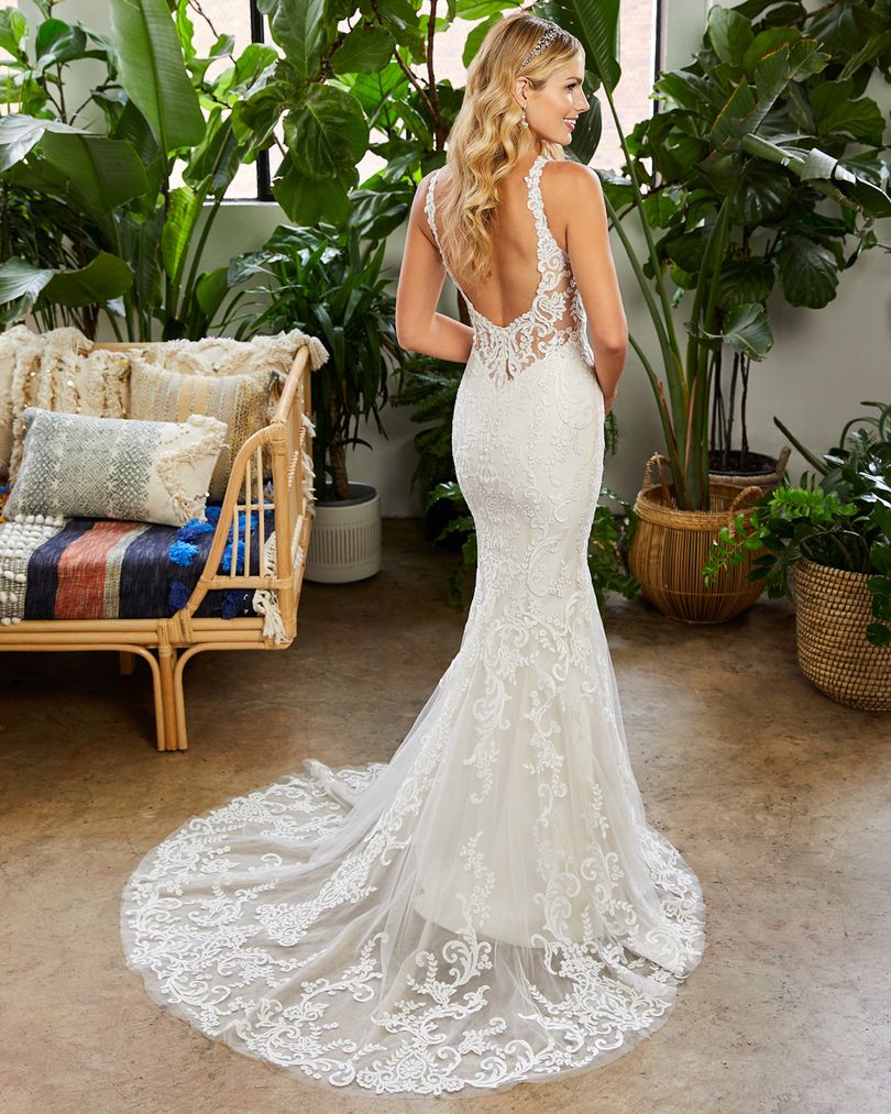A classic silhouette is taken to the next level with Style BL331 Khloe – for the bohemian bride who’s looking for something simple, yet striking! This affordable fit-and-flare wedding gown from Beloved by Casablanca Bridal is lined with stretch Georgette for comfort and covered in iridescent lace appliques for detail and subdued shimmer. The bodice features a V-neckline with straps, and is un-lined in the back to show off a strip of skin before diving into a flawless 68” lace train.