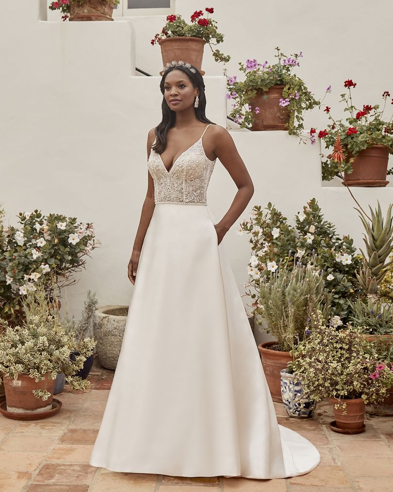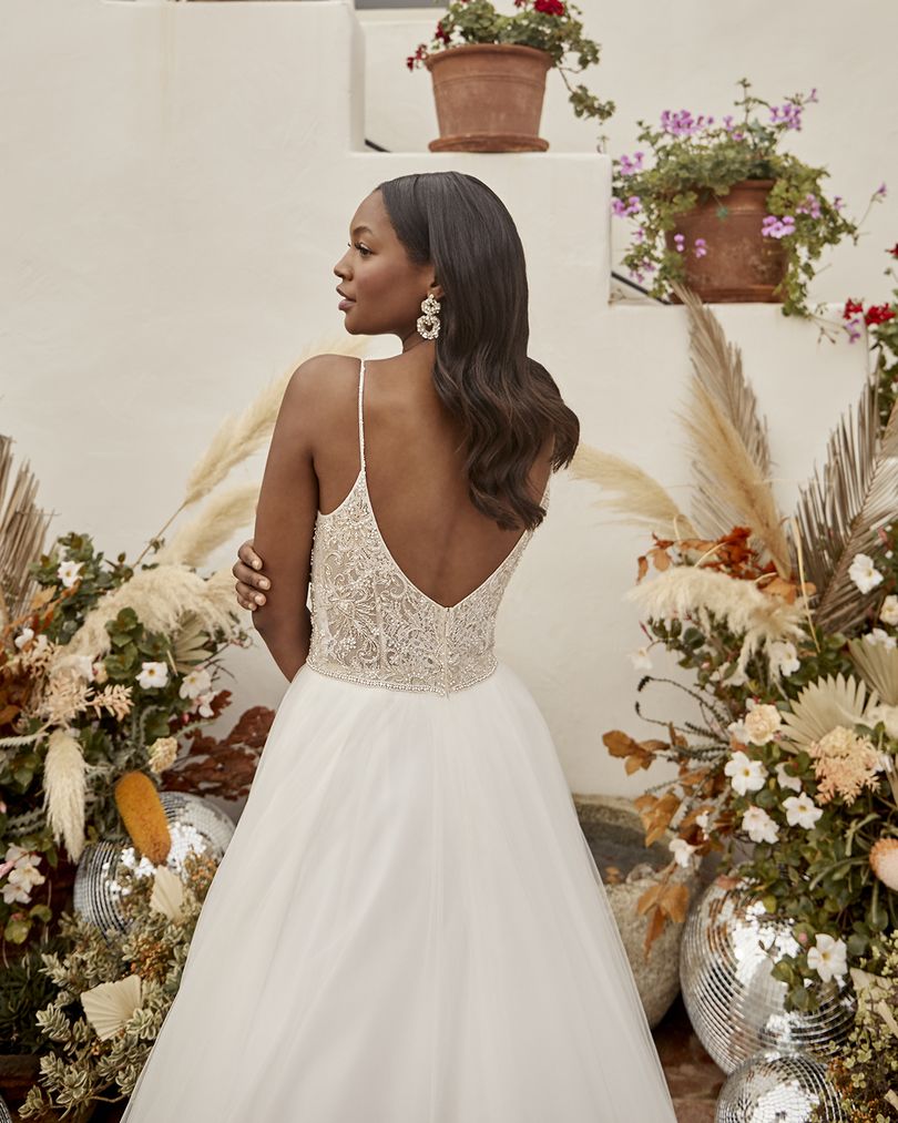 Flawlessly simple and romantic, this A-line wedding dress from Beloved by Casablanca Bridal is perfect for the modern bride. The sheer bodice on BL337 Emerald bursts with detail, decorated with swirling beading and embroidery and held up by classic spaghetti straps and a classic V Neckline which transitions into a matching V-back. The simple skirt contrasts the intricate bodice beautifully, and is available in soft tulle, for a fairytale feel, or satin, for a more sophisticated look. A 68” train trails behind, adding one last ethereal touch.
