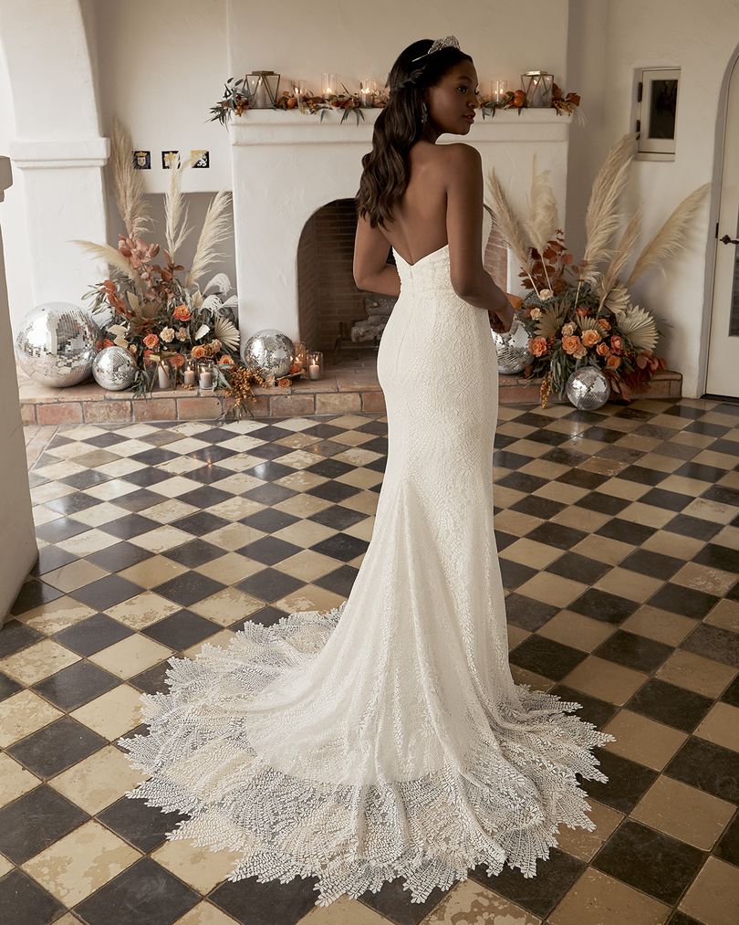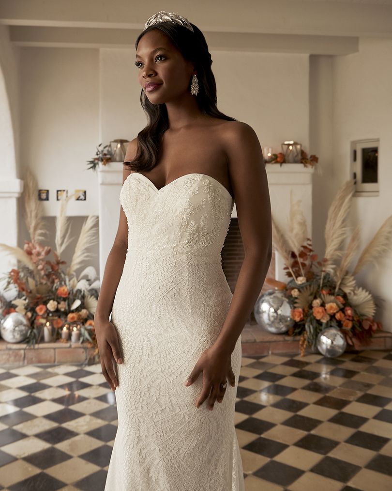 Minimal and detailed all at once, Style BL346 Asher from Beloved by Casablanca Bridal is a boho spin on a simple wedding dress. Botanical lace and sequined tulle cover this alluring gown from head to toe, wrapping around the comfortable sheath silhouette. Stretch chiffon sits underneath for maximum comfort and movability, while a strapless sweetheart neckline offers all day support. Scalloped botanical edges on the 70” sheer lace train add a unique touch of detail to this clean design.
