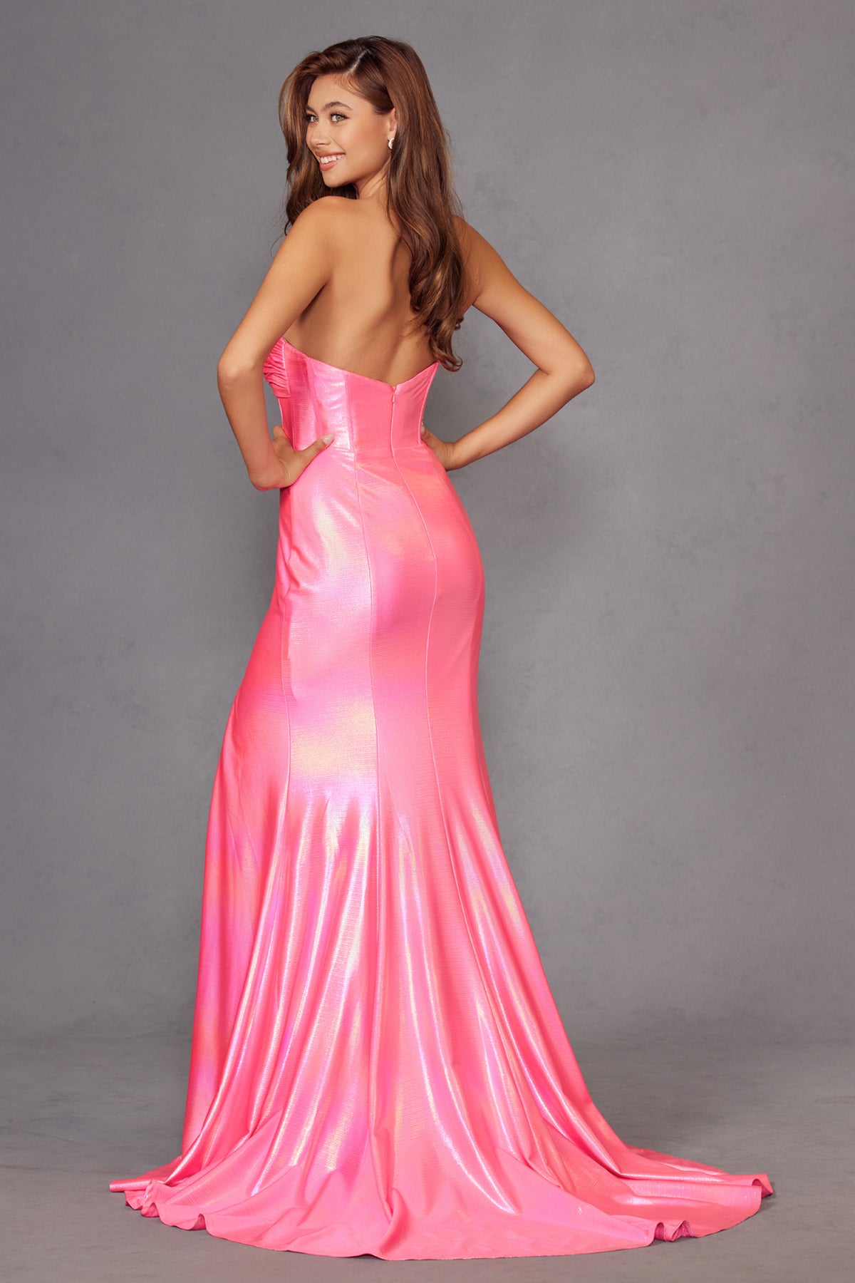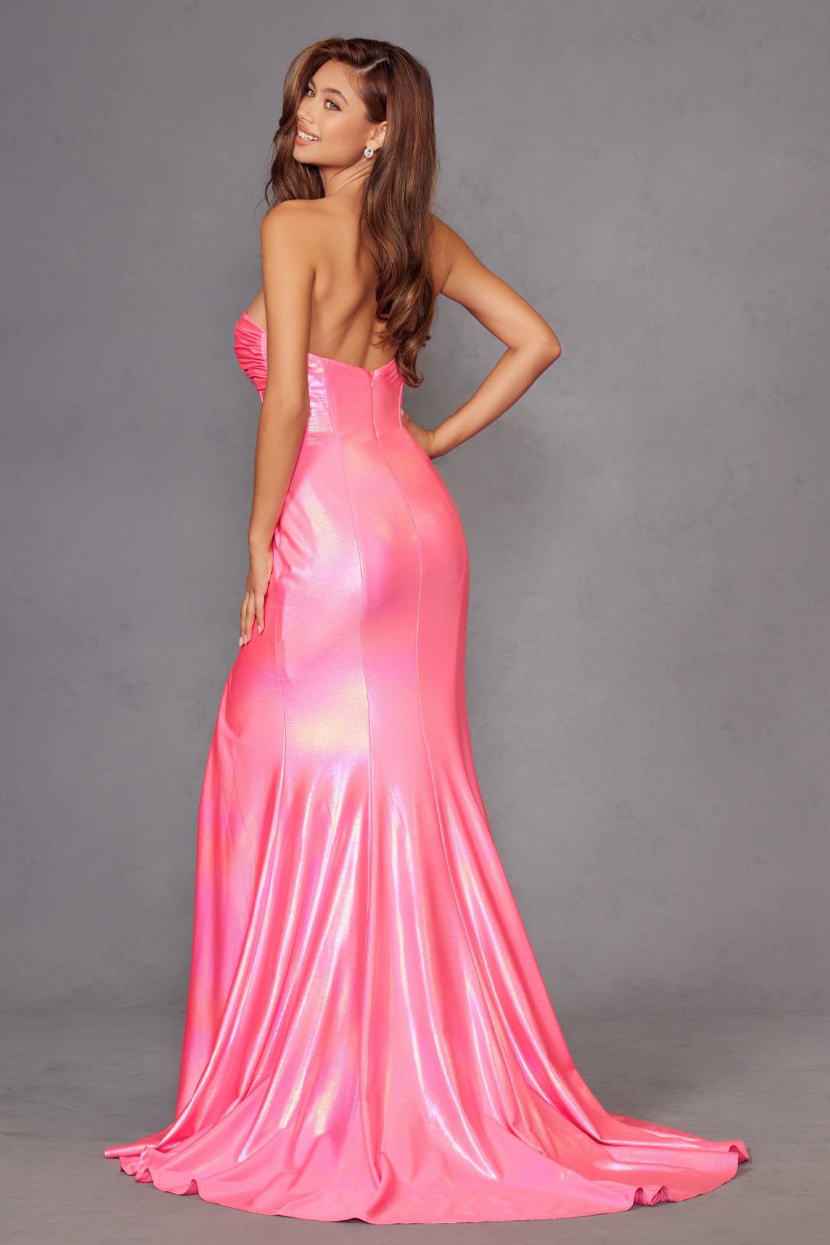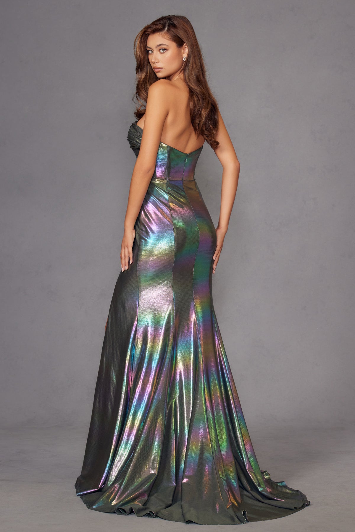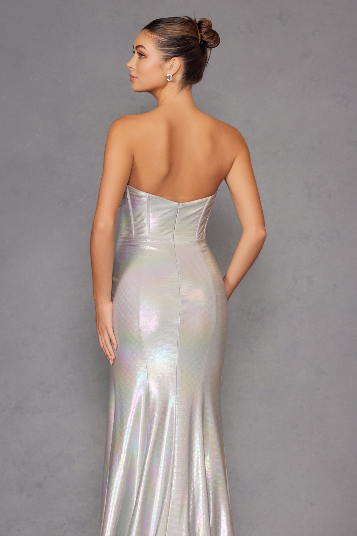 This stunning evening gown is a showstopper, perfect for making a grand entrance at any formal event. Crafted from shimmering iridescent fabric, the dress features a holographic sheen that catches the light beautifully, revealing a spectrum of colors with every movement. The design boasts a strapless sweetheart neckline, elegantly framed by a twisted knot detail at the bust, which creates an alluring keyhole cutout. A thigh-high slit on one side adds a hint of allure, making this gown both elegant and daring. Ideal for proms, galas, or any special occasion where you want to shine, this gown is a must-have for your collection.
