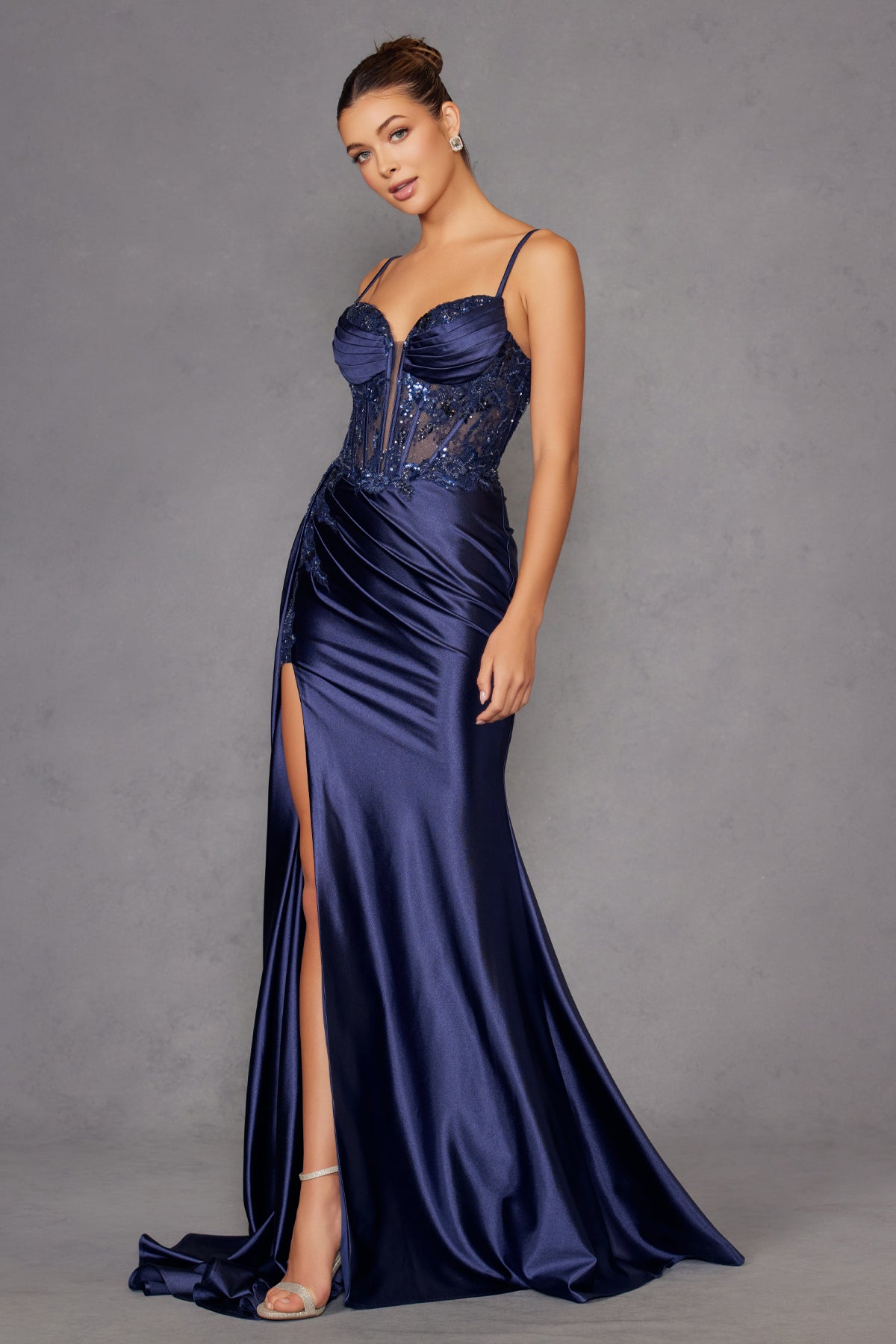 This elegant evening gown is a perfect choice for any formal occasion. The dress features a fitted bodice adorned with intricate beaded embroidery and sequins, creating a sparkling effect. The sweetheart neckline and structured boning enhance the form-fitting silhouette. The skirt is smooth and draped, with an asymmetrical gathering at the waist that cascades into an elegant side slit, revealing part of the leg. A sheer overlay extends from the waistline, adding an extra layer of fabric that flows gracefully to the hem of the dress. This combination of classic elegance and modern design details makes this gown a standout piece, ensuring you make a memorable entrance at any event.
