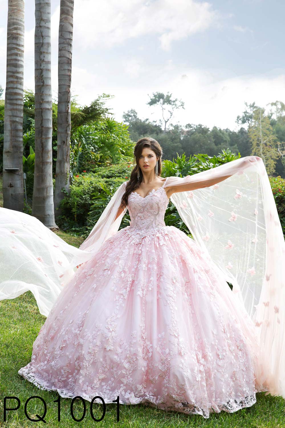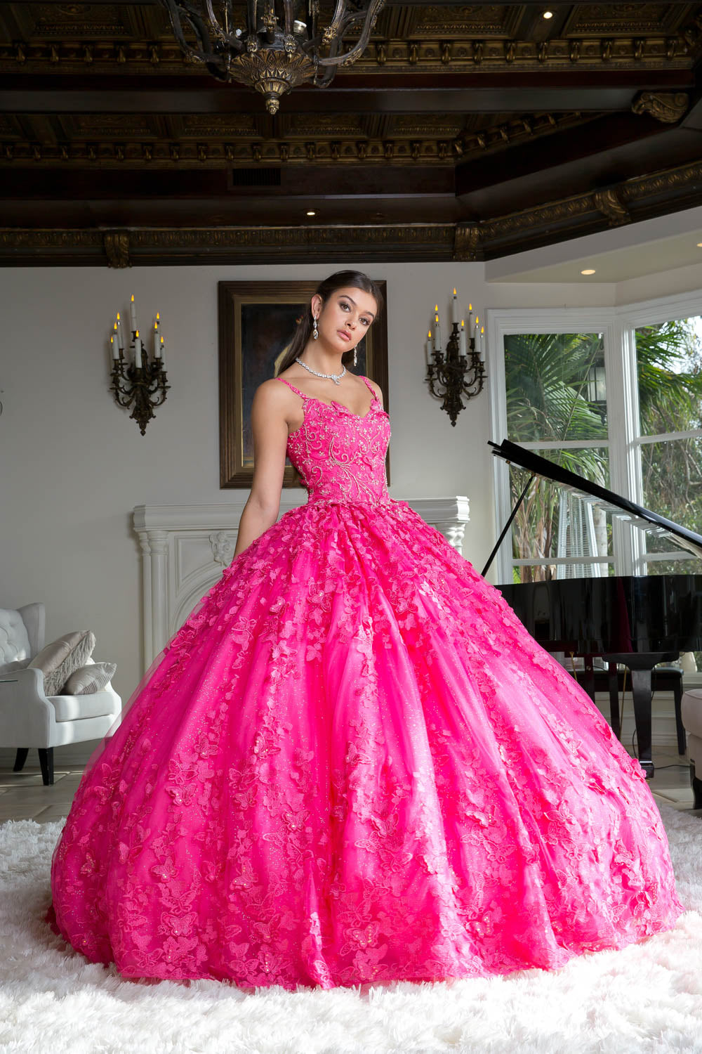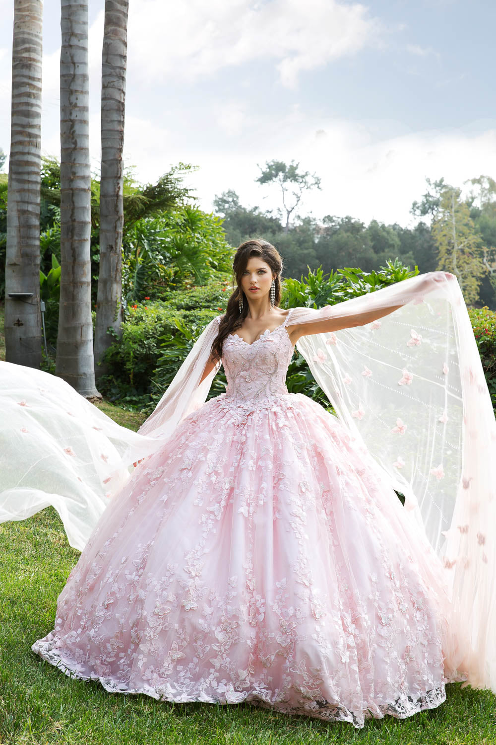 3D Butterfly Ophelia Quince dress, perfect dress to feel like a princess on your special night. Featuring a stunning cape, a hidden zipper in the lower back and lace up in the upper back. This dress also has a sweetheart neckline and 3D butterfly with glitter. This dress is offered in three colors