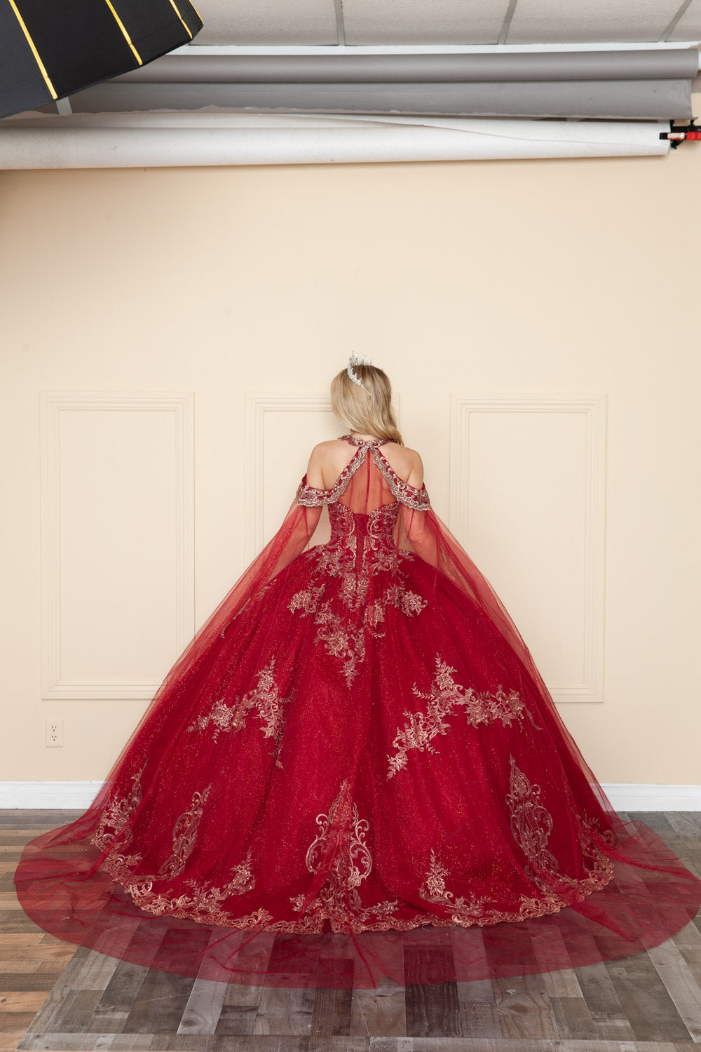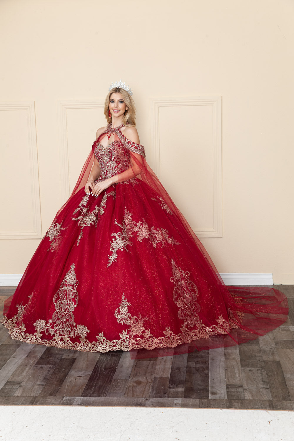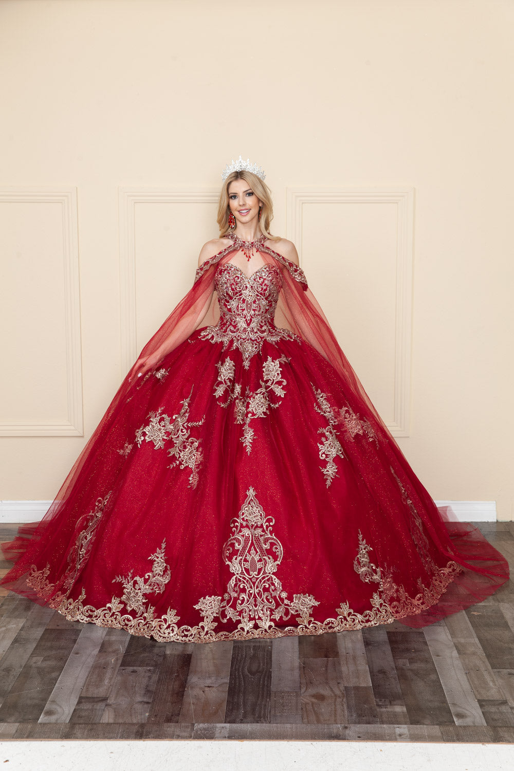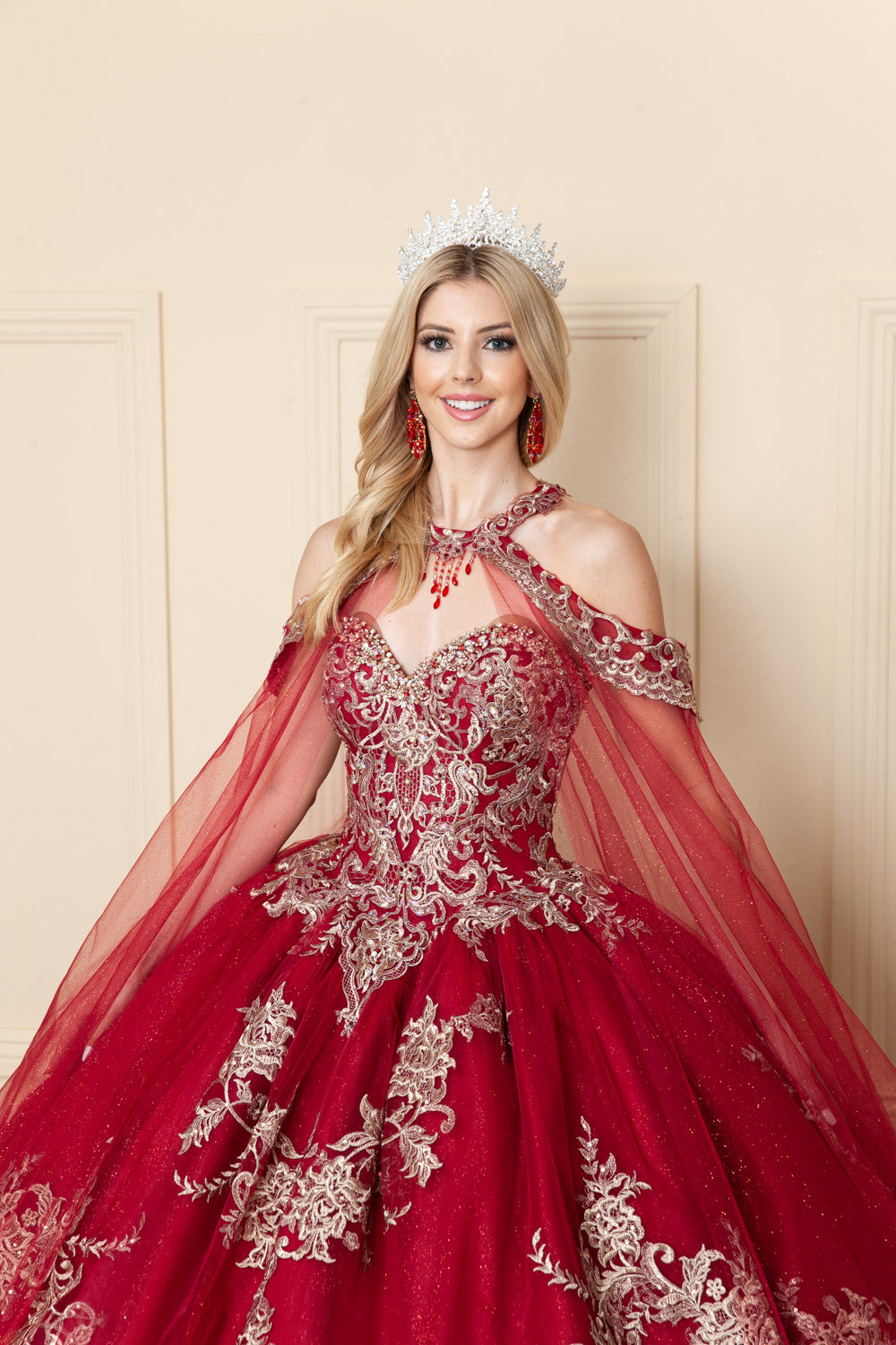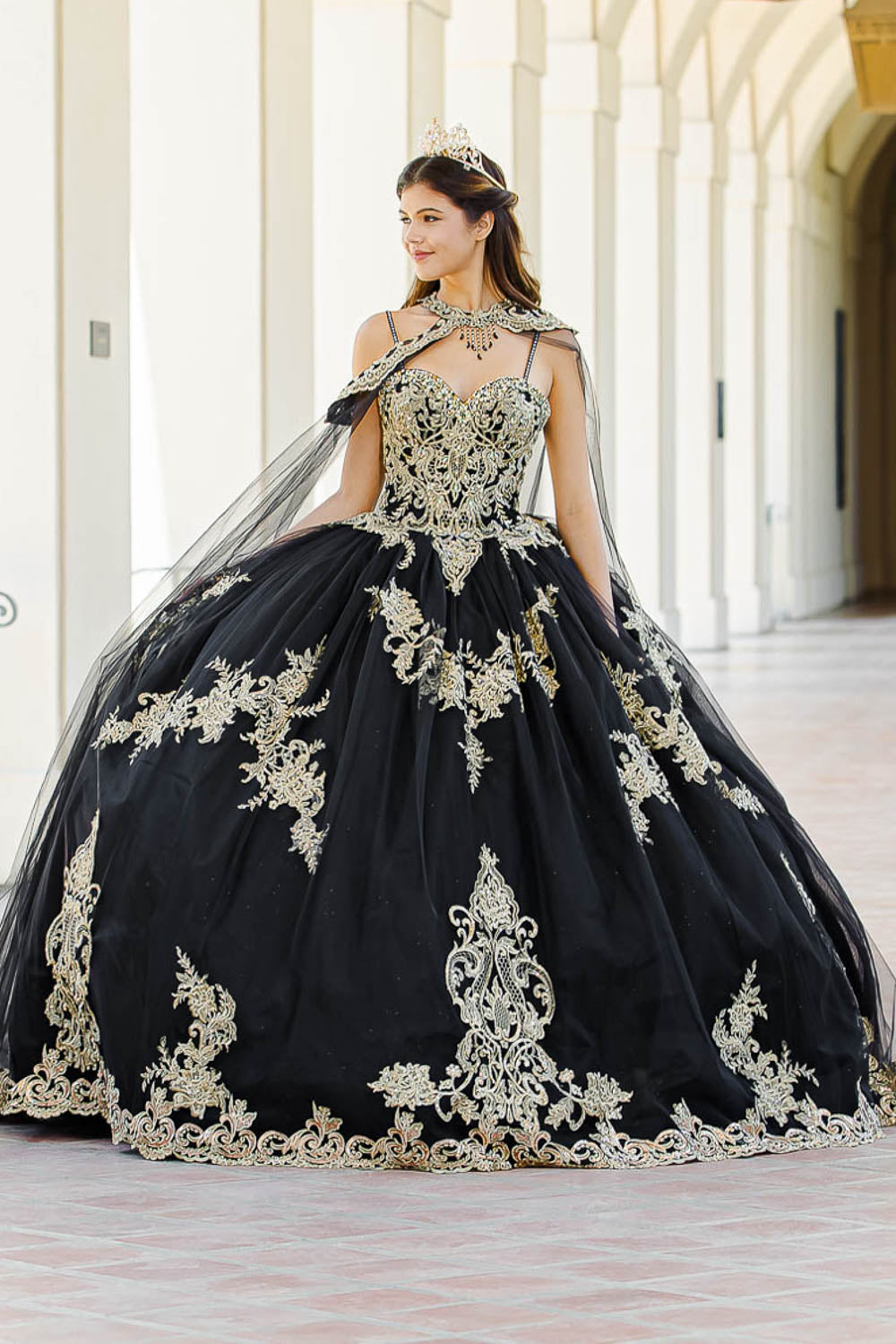 Be ready to make a grand entrance in this show-stopping Quinceanera dress! Complete with a sweetheart bodice with crystal beading and gold embroidered lace details, this princess dress will leave you feeling glitzy and glamorous. A timeless classic with a modern twist, this cape will add a magica touch.