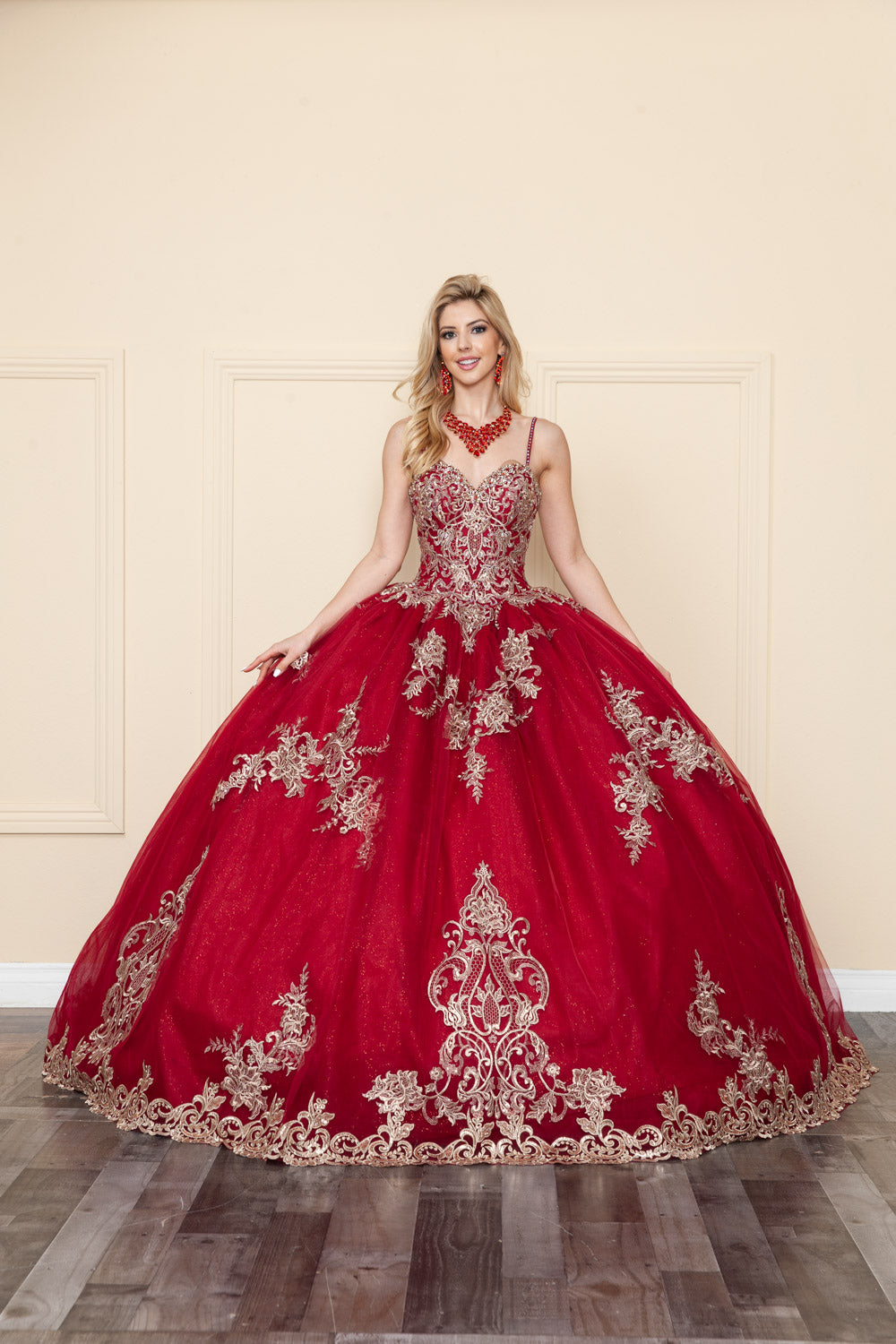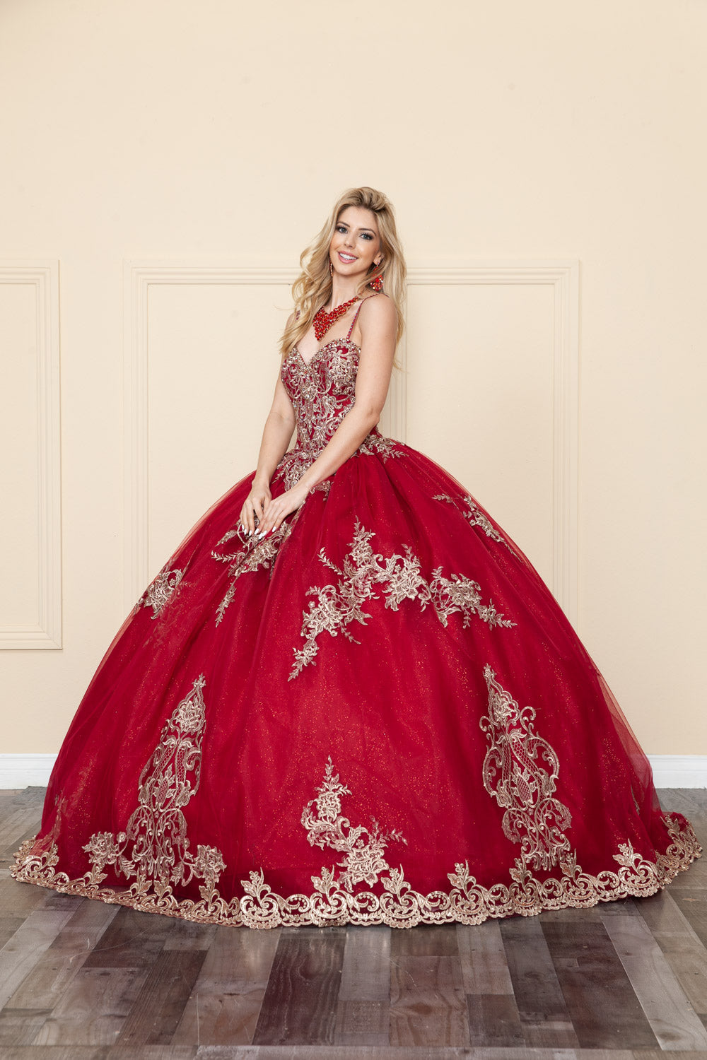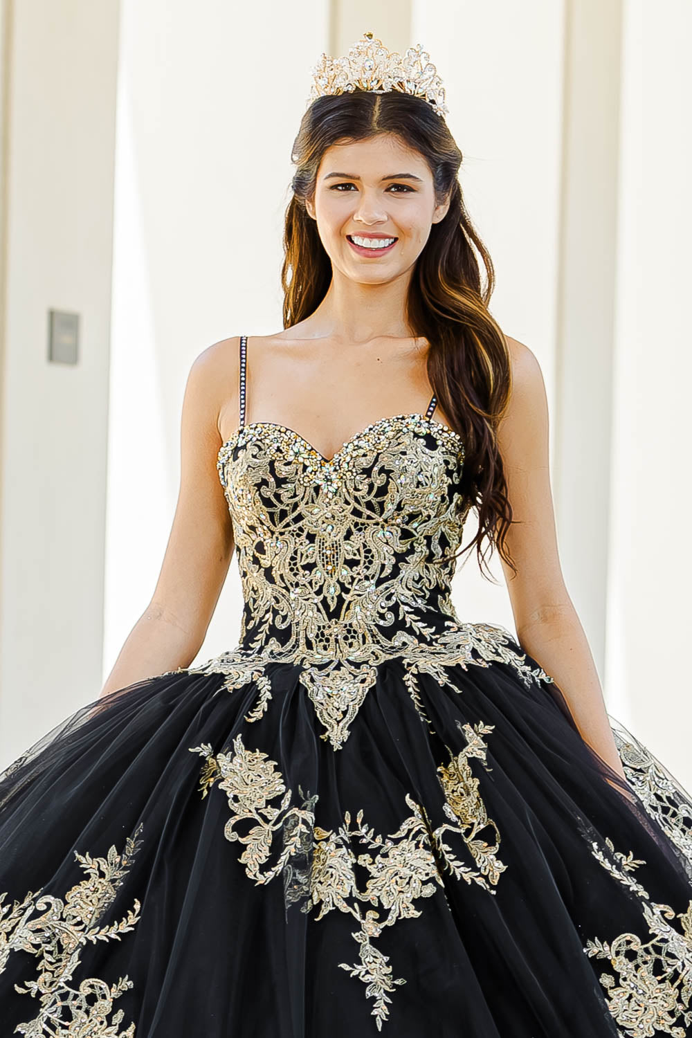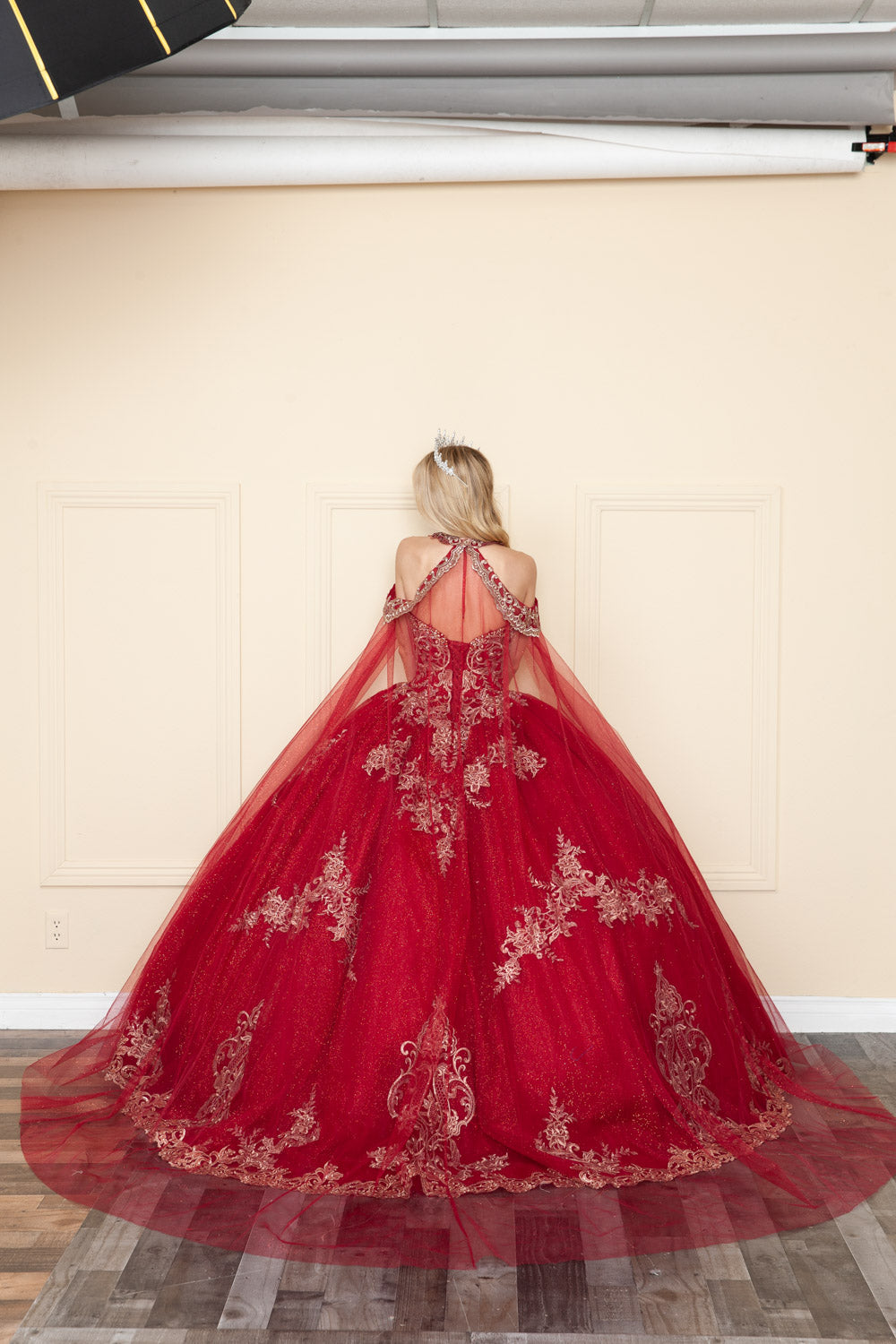 Be ready to make a grand entrance in this show-stopping Quinceanera dress! Complete with a sweetheart bodice with crystal beading and gold embroidered lace details, this princess dress will leave you feeling glitzy and glamorous. A timeless classic with a modern twist, this cape will add a magica touch.