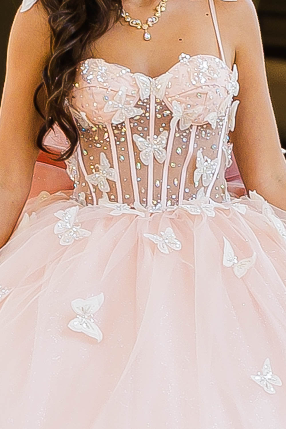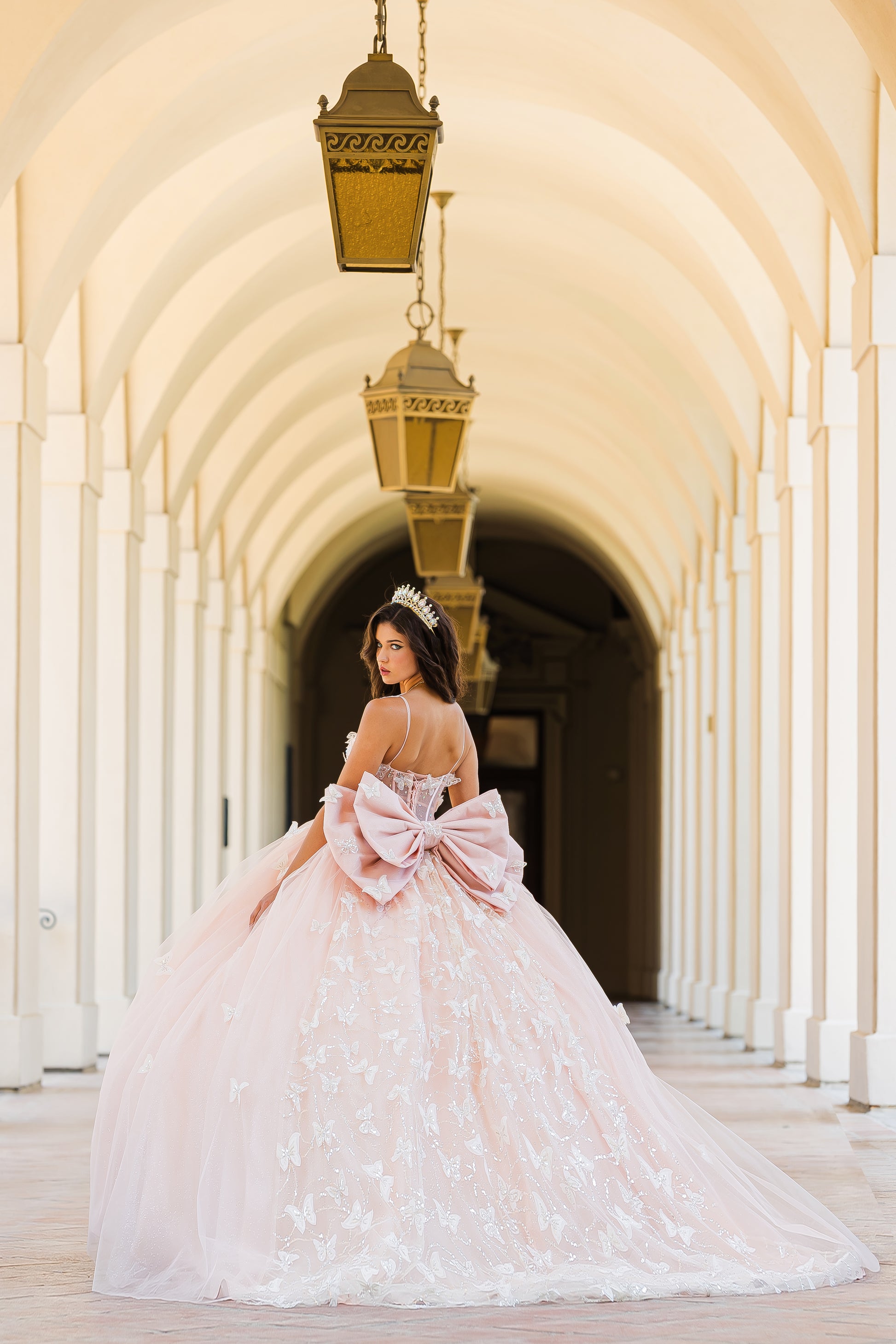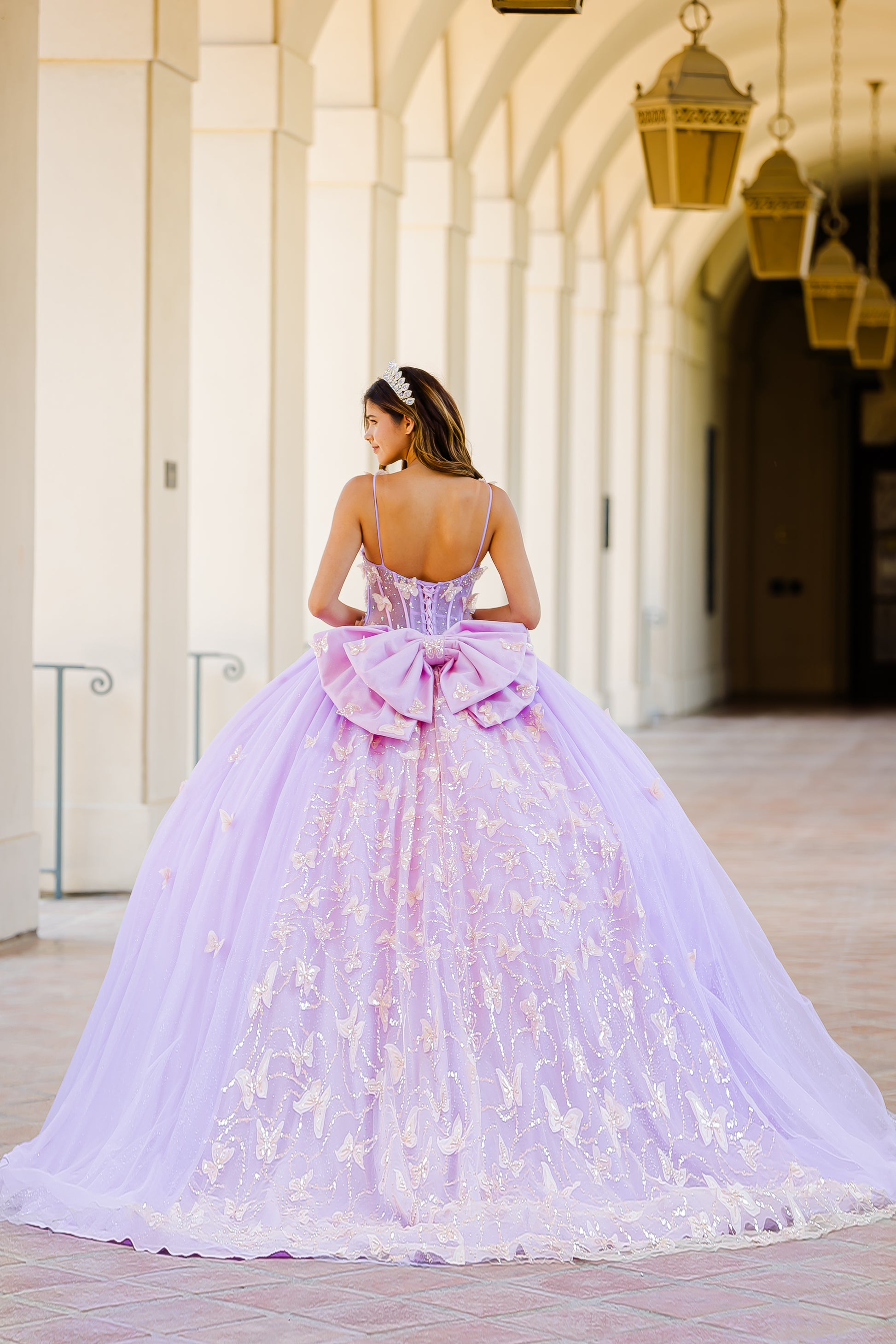 Behold this bonny beaded bodice with see-through glitz, with a detachable dreamy lining for bodice. 260" skirt-width, with a touch of 3D butterfly- so sweet! And don't forget the detachable bow with a train that will make you feel like a princess on your special night. For that one-of-a-kind quinceanera dress, revel in this radiant beaded beauty!