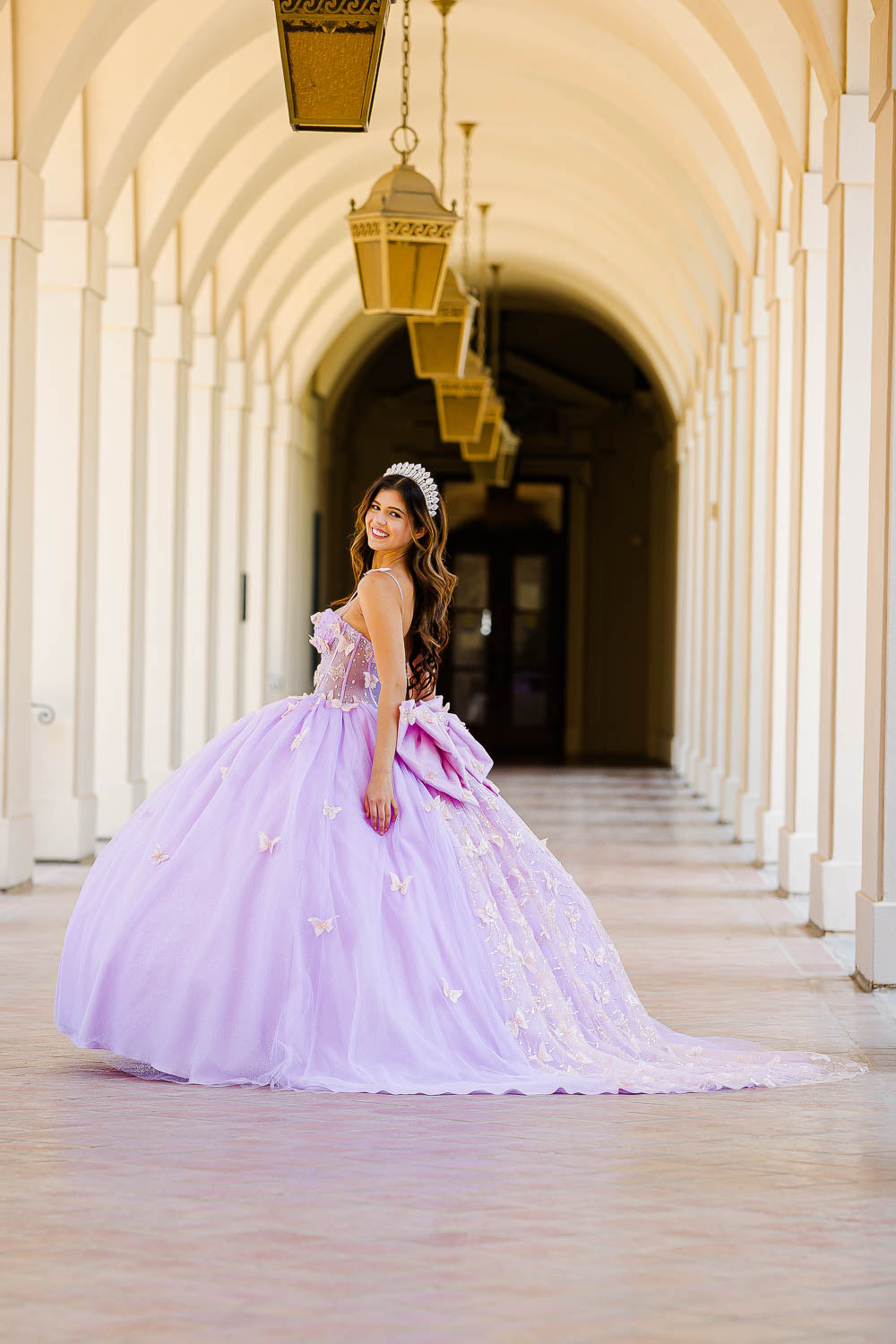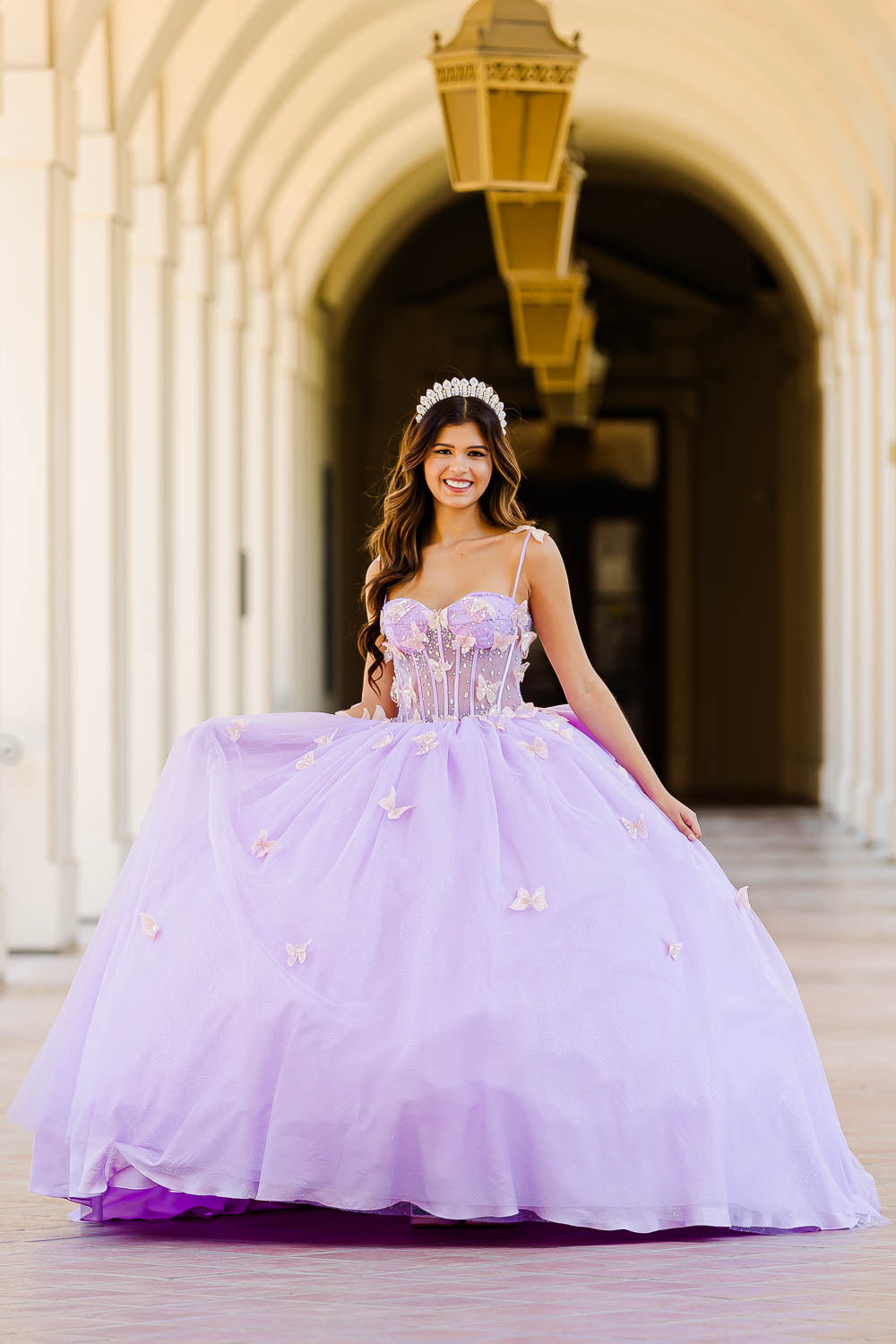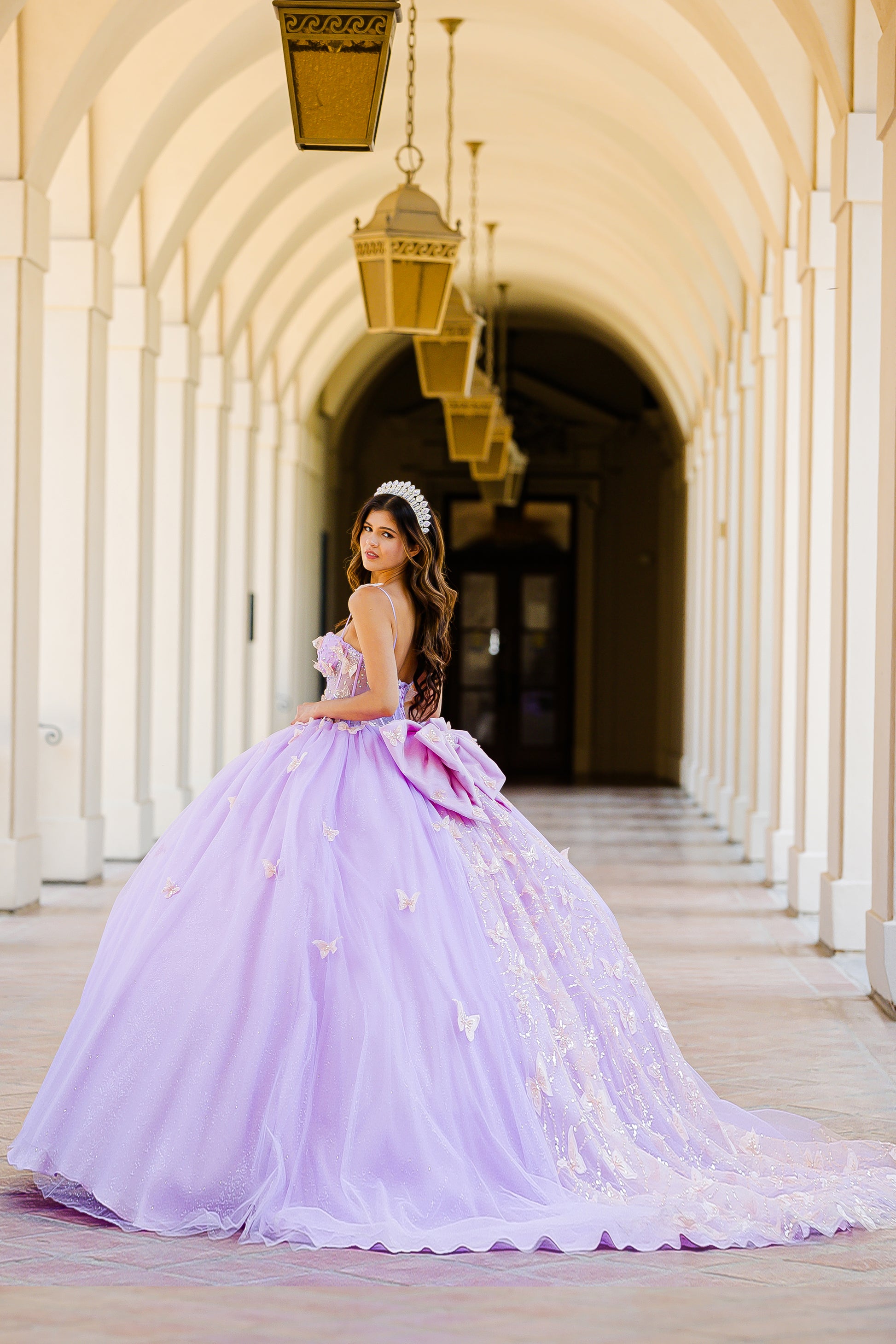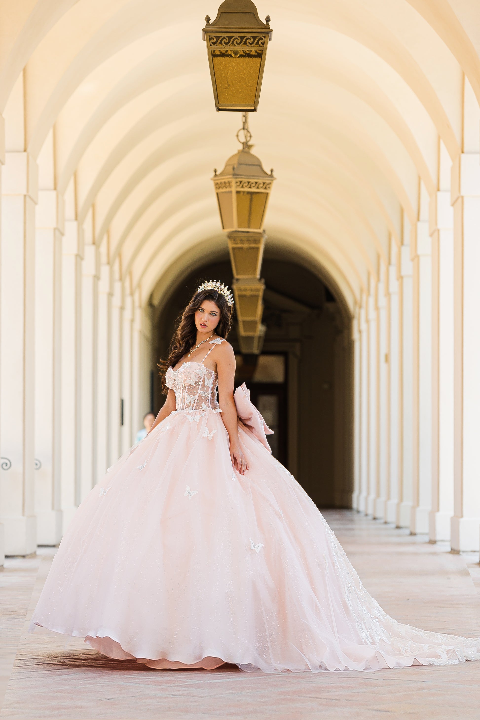 Behold this bonny beaded bodice with see-through glitz, with a detachable dreamy lining for bodice. 260" skirt-width, with a touch of 3D butterfly- so sweet! And don't forget the detachable bow with a train that will make you feel like a princess on your special night. For that one-of-a-kind quinceanera dress, revel in this radiant beaded beauty!