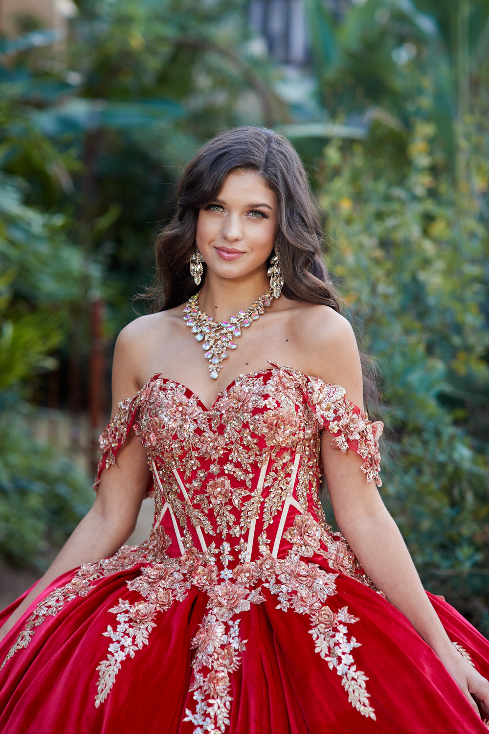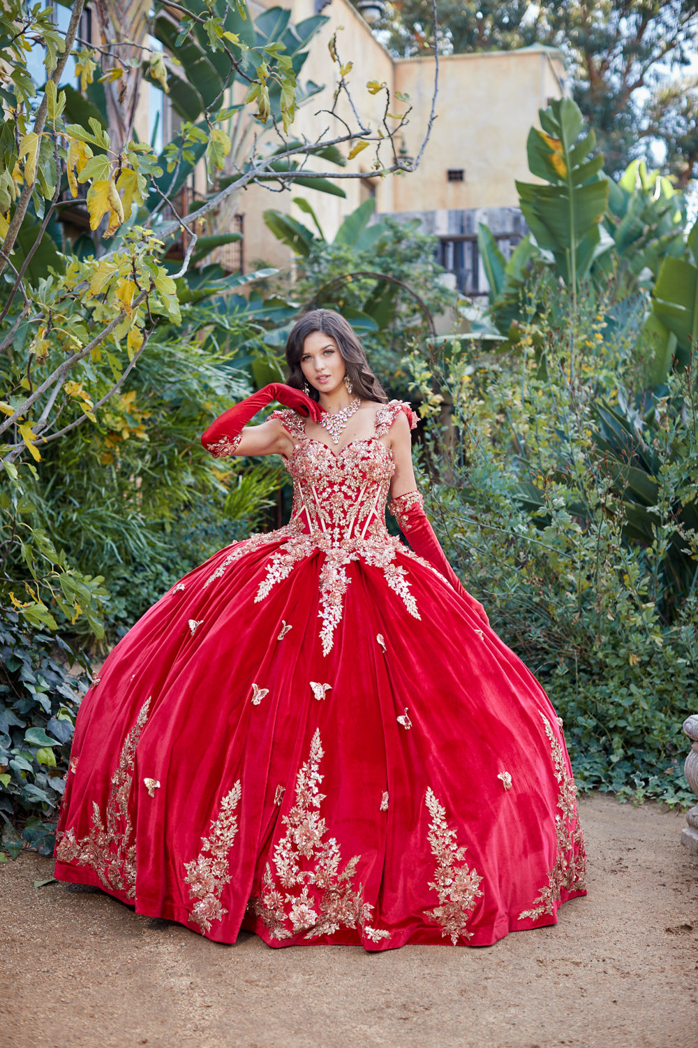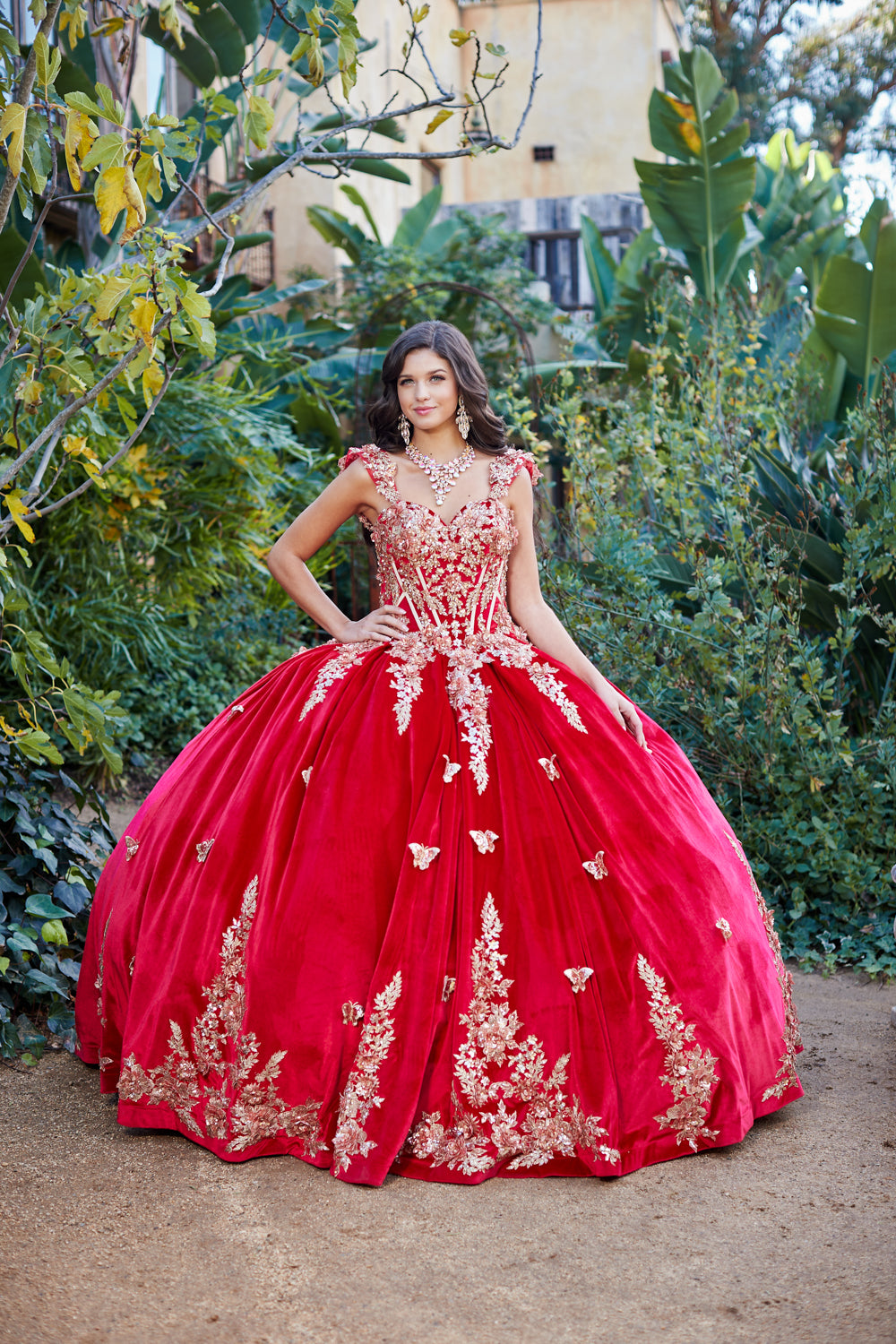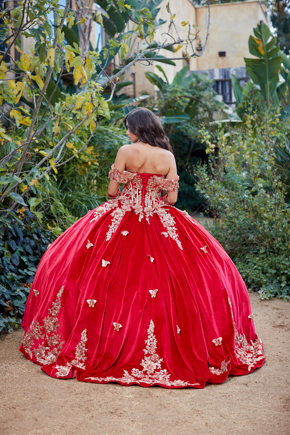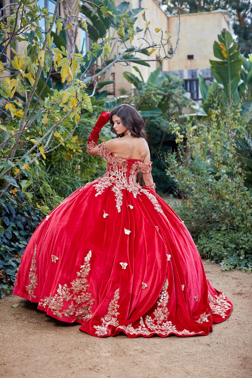Look dazzling on your special night with this velvet sweetheart neckline, flirty off-shoulder fit, and a sweep train. Gold sequin floral embroidery and sequin butterflies decorate this enchanting dress.