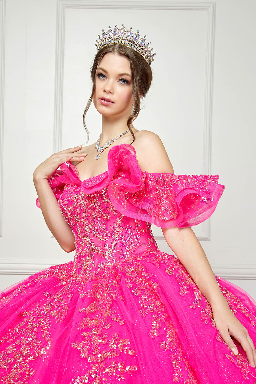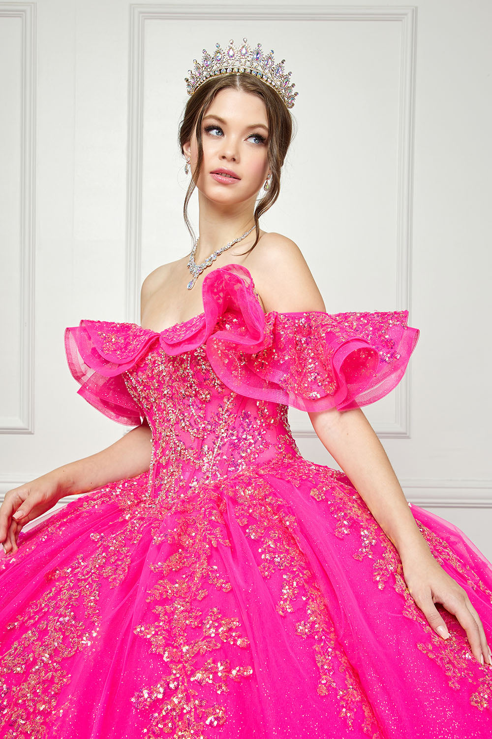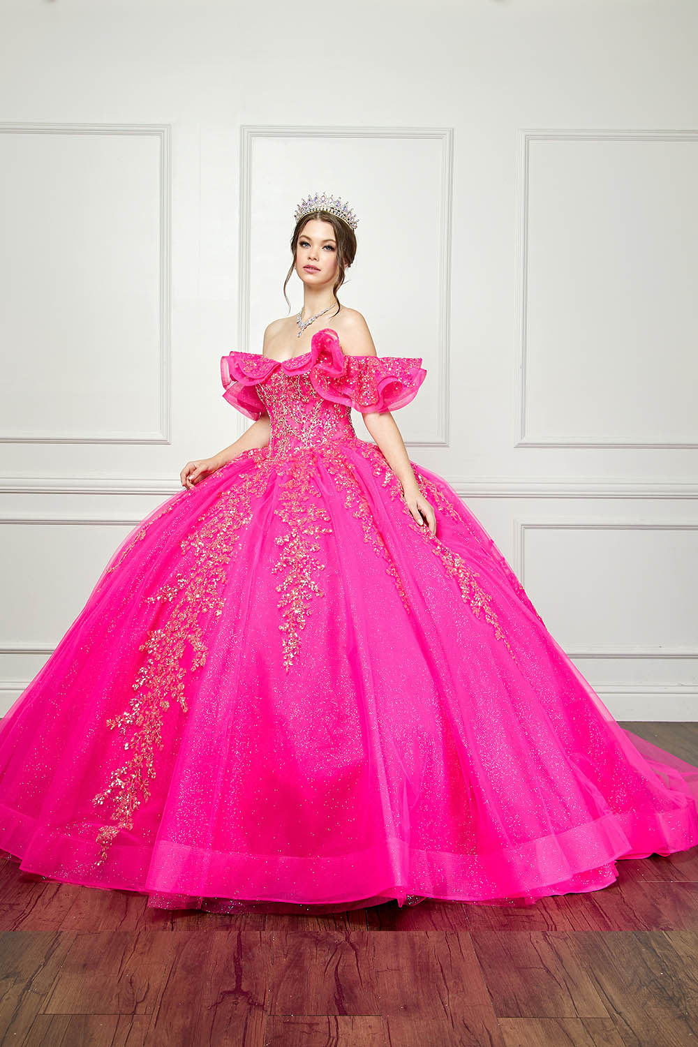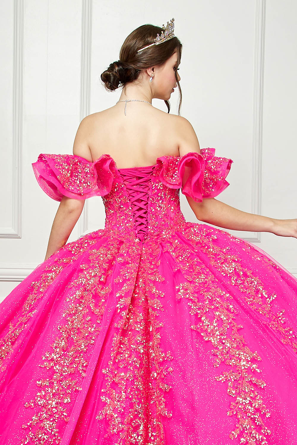 Shimmer and shine in this Hot Pink Iridescent Sequin Dress. With its ruffle detail and glittering design, it's perfect for making a statement. The sweep train adds a touch of elegance, while the see-through corset adds a hint of allure. Perfect for ball gowns and the latest Quinceanera trend.