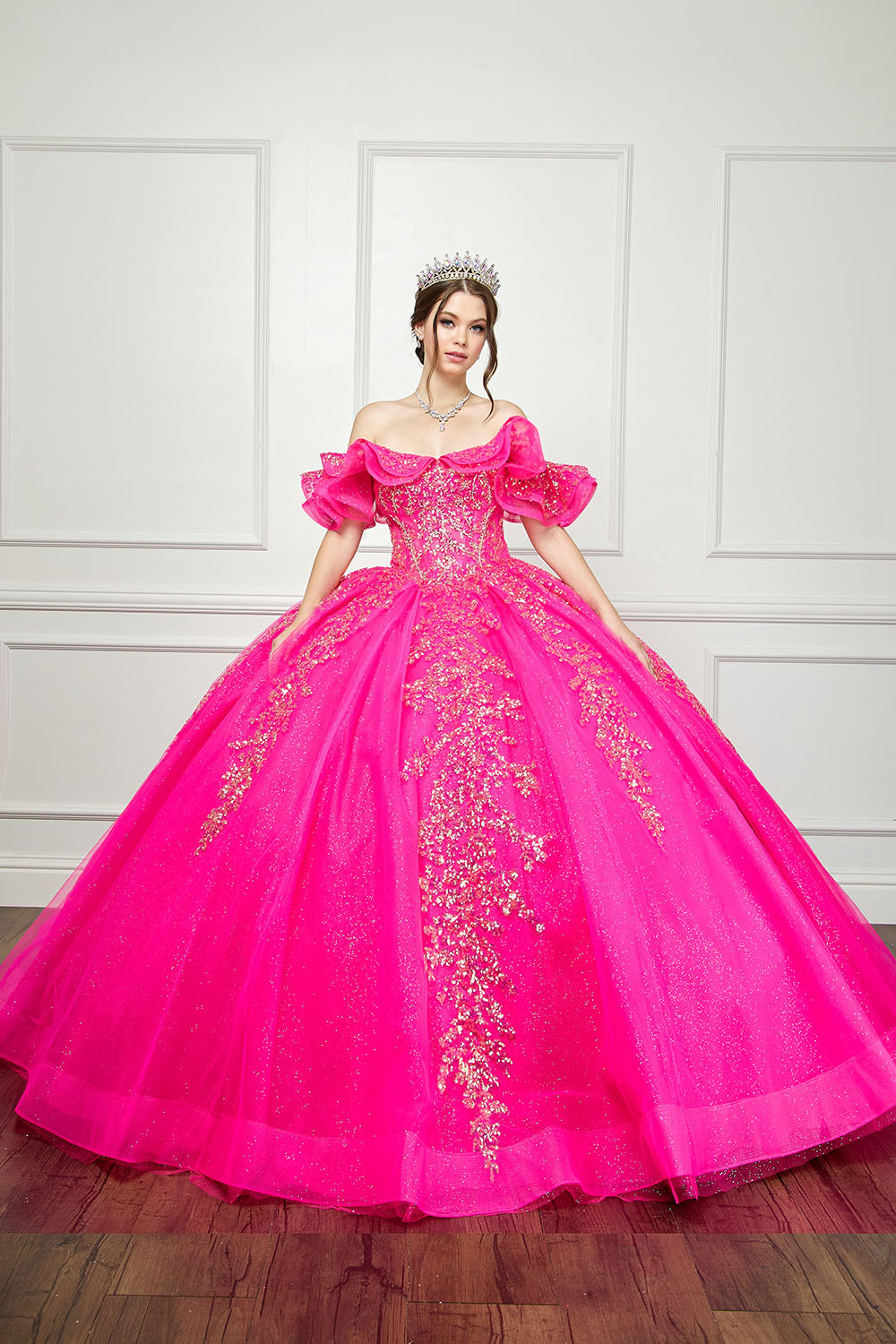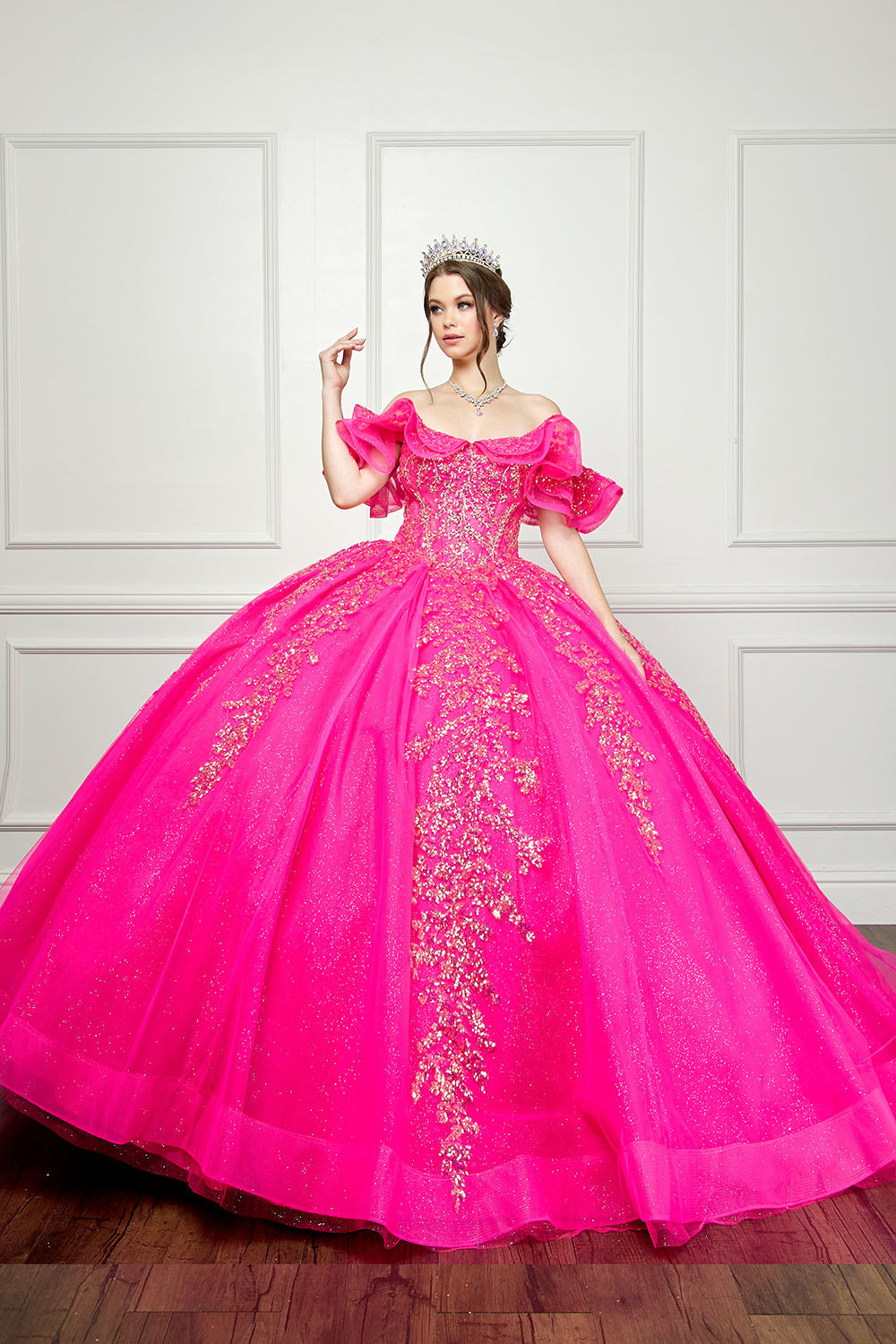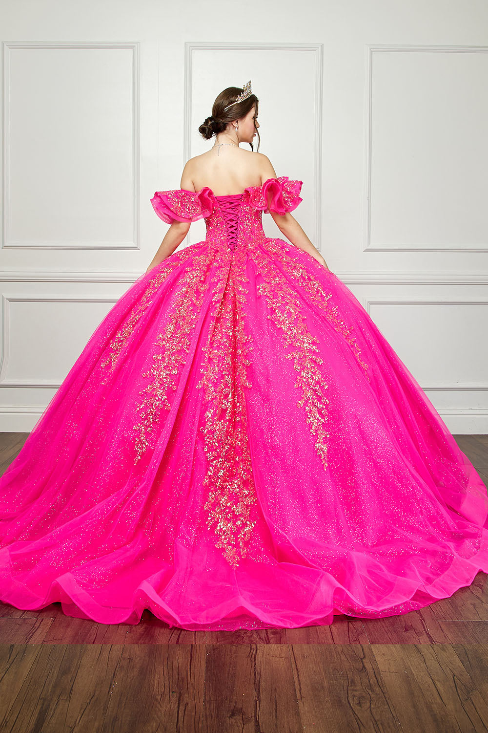 Shimmer and shine in this Hot Pink Iridescent Sequin Dress. With its ruffle detail and glittering design, it's perfect for making a statement. The sweep train adds a touch of elegance, while the see-through corset adds a hint of allure. Perfect for ball gowns and the latest Quinceanera trend.
