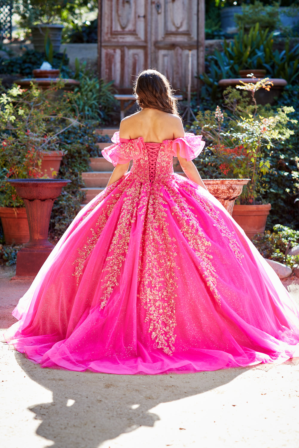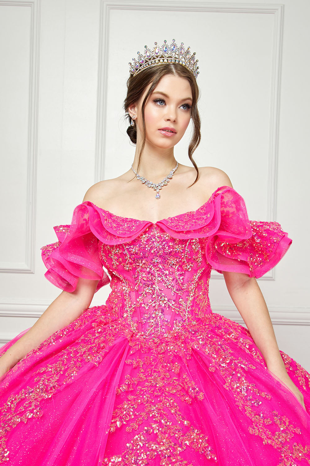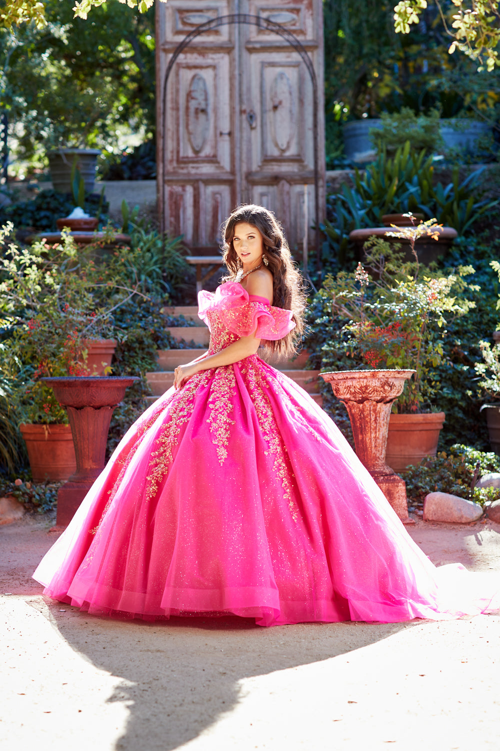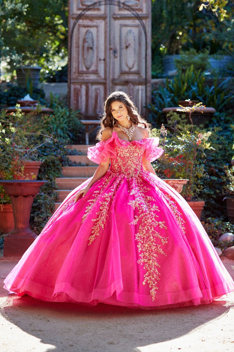Shimmer and shine in this Hot Pink Iridescent Sequin Dress. With its ruffle detail and glittering design, it's perfect for making a statement. The sweep train adds a touch of elegance, while the see-through corset adds a hint of allure. Perfect for ball gowns and the latest Quinceanera trend.