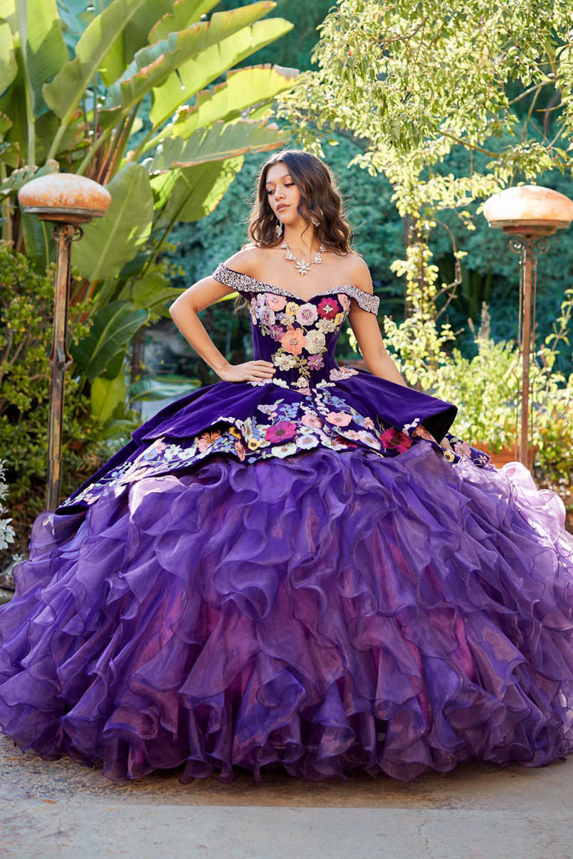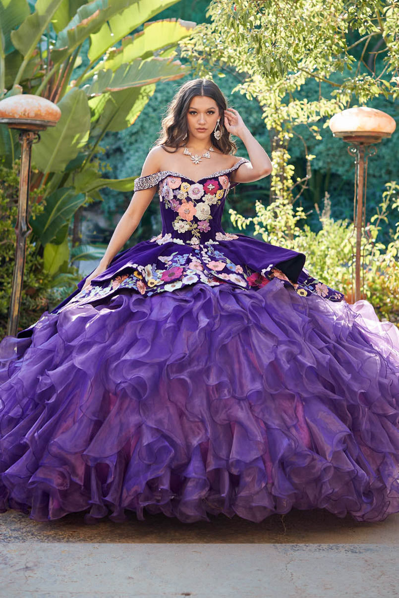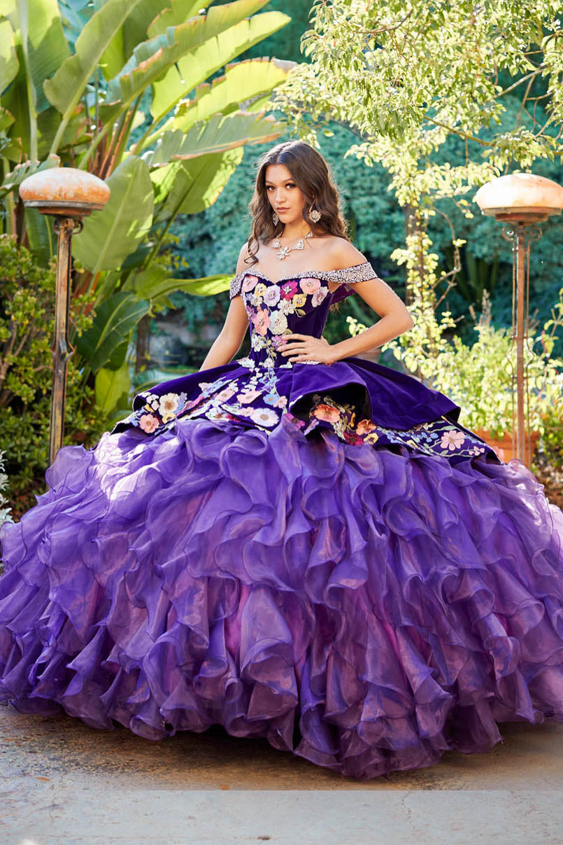 Step into the spotlight with this beautiful Charro Multi Colored Floral Gown. This dazzling dress features iridescent gemstones, a charro-inspired design, and vibrant mixed-colored floral embroidery. The velvet fabric and organza ruffled overlays add a touch of elegance, while the off-shoulder neckline and gem detail create a glamorous look. Complete with a laced corset and sweep train, this Quinceanera Dress is perfect for making a statement at any special occasion.